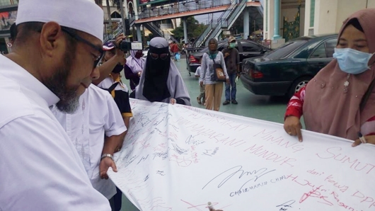 Mereka secara bergantian menandatangani spanduk putih. Kemudian, mereka memegangnya ke hadapan masyarakat.