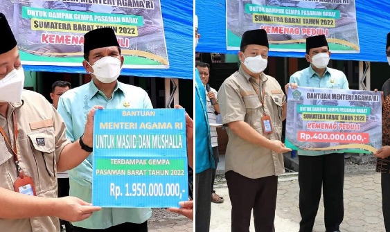 BENTENGSUMBAR.COM - Menteri Agama Yaqut Cholil Qoumas, menyalurkan bantuan senilai Rp 2,35 miliar, untuk masyarakat terdampak gempa Pasaman Barat. Gempa dengan magnitudo 6,1 yang terjadi 25 Februari 2022 lalu, mengakibatkan korban jiwa, serta kerusakan sejumlah masjid dan mushala.