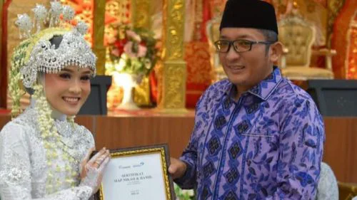 Penyerahan sertifikasi Elsimil ini dilakukan oleh Wako Hendri Septa usai menjadi saksi nikah kedua pasangan tersebut, bertempat di Gedung Adzkia Convention Hall, Sabtu (11/2/2023).