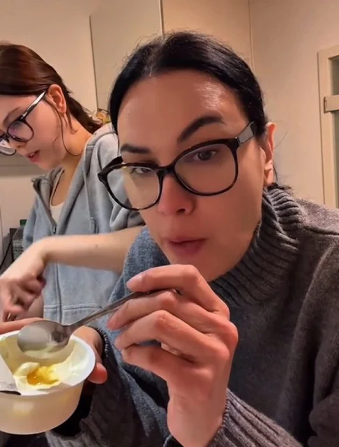 | Sembari mengawasi putrinya memasak, Sophia sambil menyantap makanan. |
